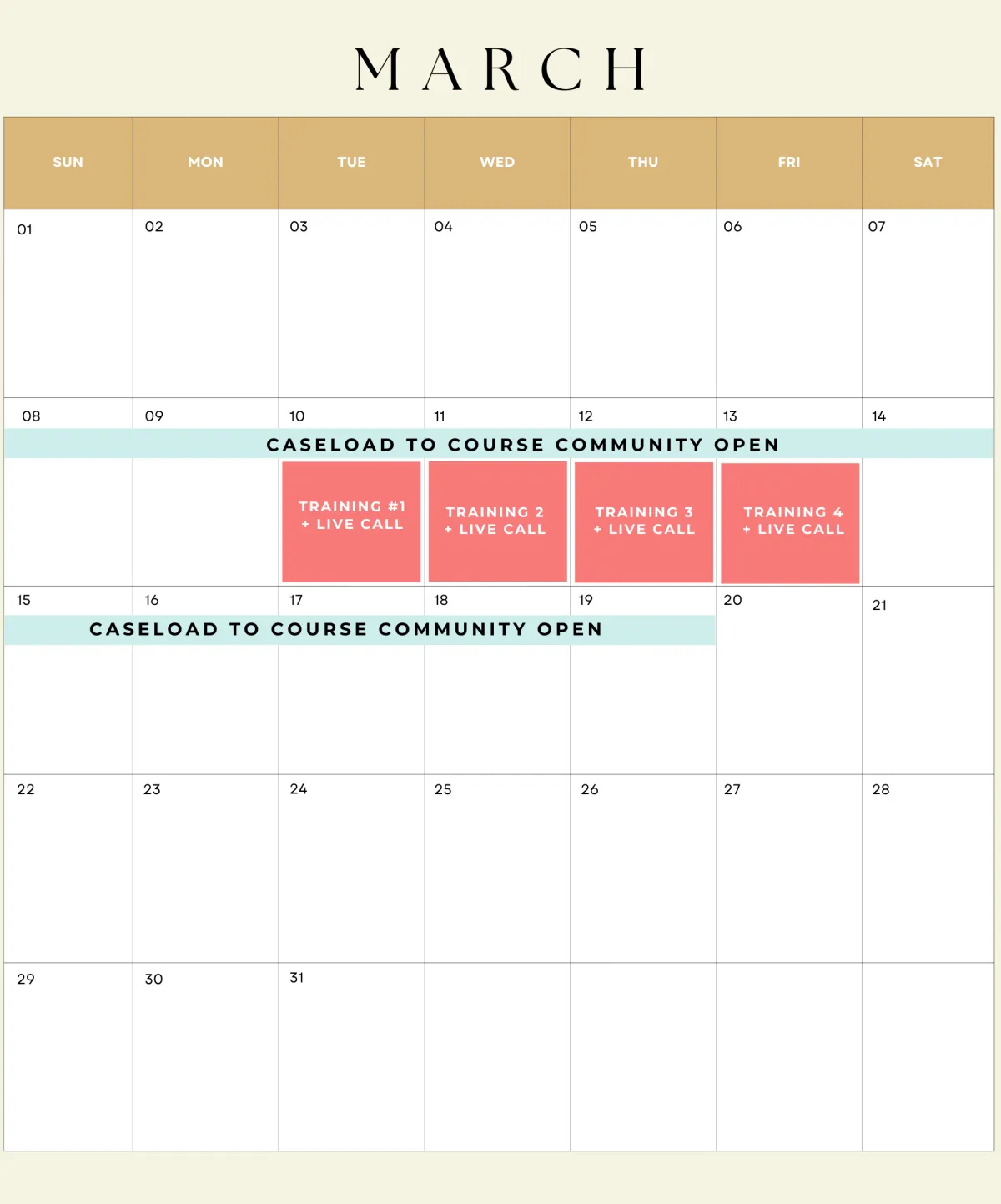No problem. The trainings are pre-recorded, and the live calls are recorded. Show up live if you can (real-time feedback is valuable), but you'll have training recordings and replays until March 19 if you can't.