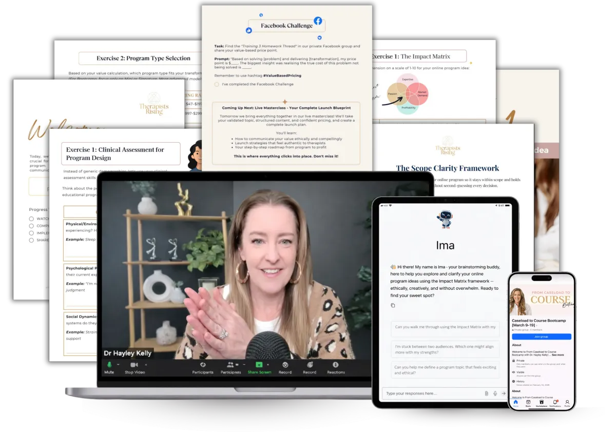Created by therapists, for therapists, this exclusive live Bootcamp will give you clarity on the exact steps to build an ethical and profitable online program—no tech overwhelm, no guesswork, no wasted time.